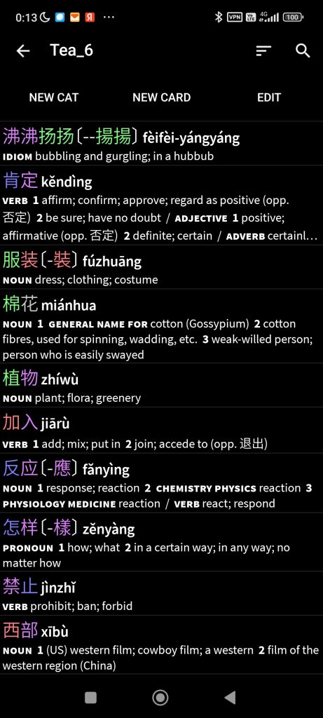 С утра я занимаюсь словами по карточкам в Pleco. Карточки добавляю из текстов, которые слушаю и читаю тоже в Pleco. До этого пользовался приложением DoChinese. Длится это занятие 10-30 минут. SRS не использую, просто занимаюсь в формате теста всем списком слов прочитанного последним текста. Иногда вначале просматриваю весь список слов, пробую немного позапоминать слова и только потом запускаю тест.
