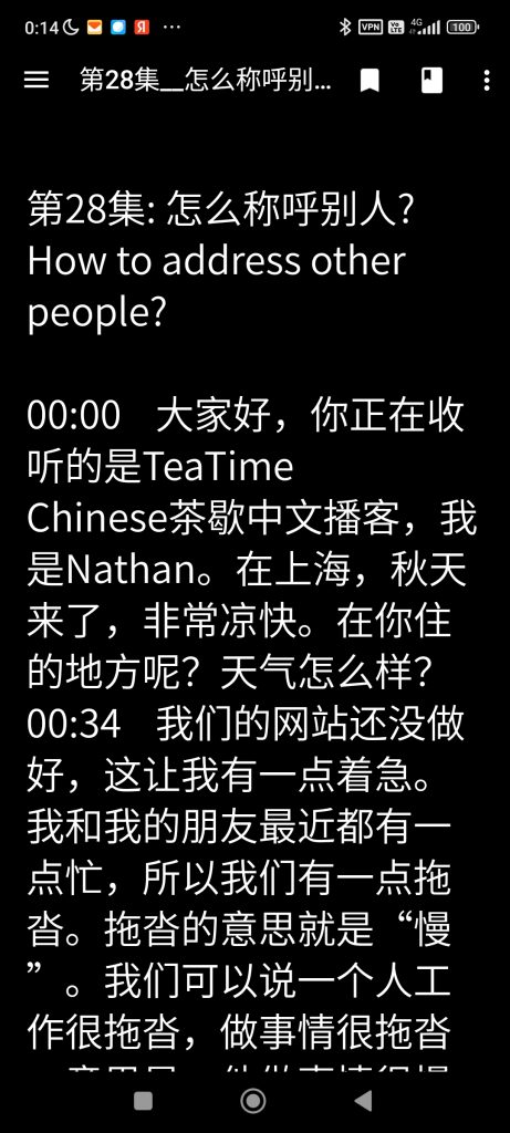 И вечером 40 минут читаю — сейчас в Pleco, а раньше это был Do Chinese. Также были и скоро снова будут бумажные книжечки из серии chinese breeze (прочитал все для словарного запаса 300 и 500 слов). Когда читаю, добавляю новые или забытые слова из текста в карточки, по которым занимаюсь по утрам. Каждый текст сейчас я читаю 2 раза и 2 раза слушаю, чередуя аудио и текст. Конкретно сейчас слушаю/читаю подкаст Tea Time Chinese (茶歇中文). Автор гооврит небыстро и речь простая, что для меня сейчас подходит идеально. Проработал чуть меньше трети всех выпусков, которых на данный момент 100. Очень хочется понять, буду ли знать большую часть слов первых 4х HSK (старого образца), когда закончу разбирать все выпуски. Но на HSK я не зацикливаюсь — мне ближе более естественное расширение словарного запаса, нежели выучивание слов по списку.